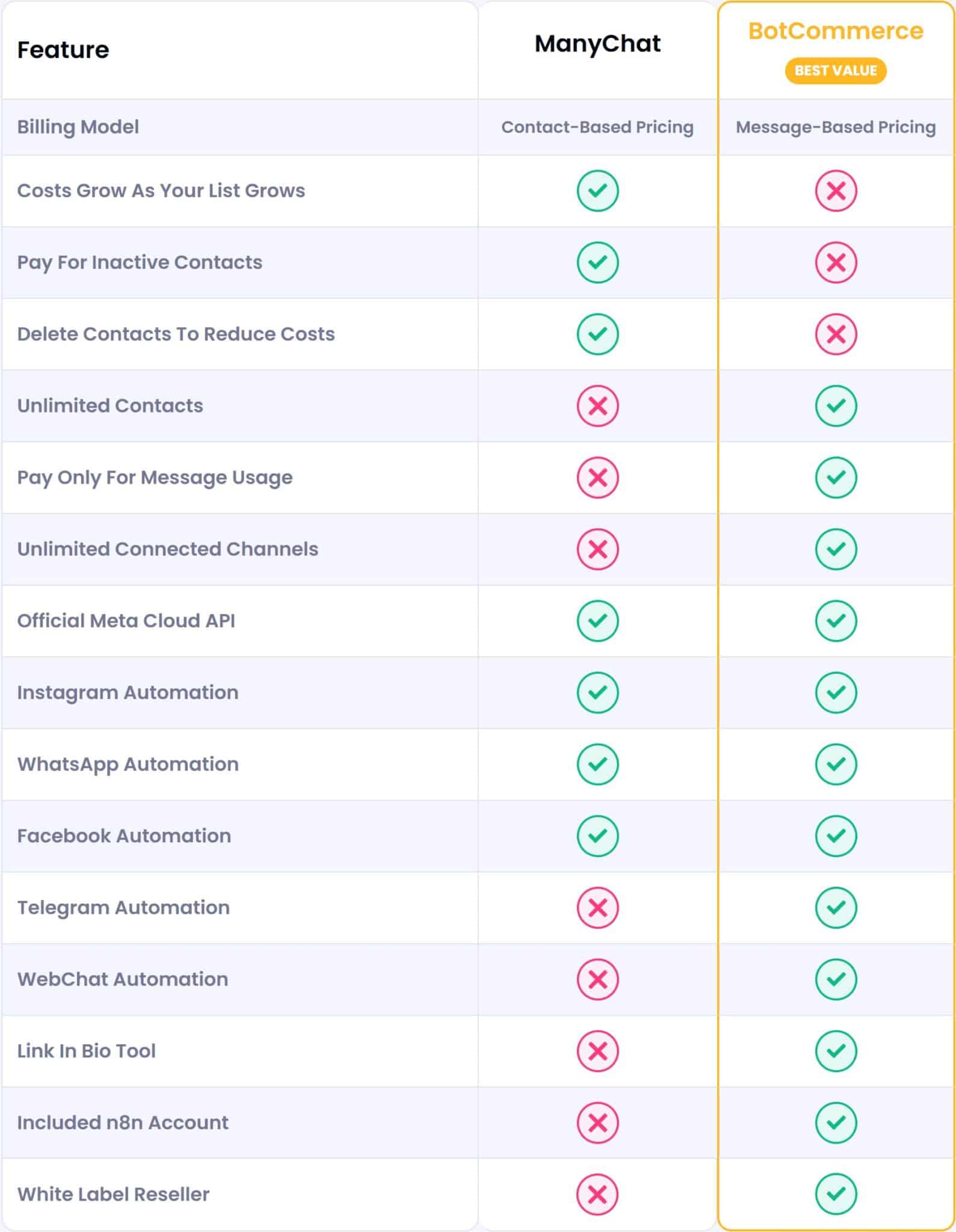 ManyChat pricing grows as your contact list grows. BotCommerce charges only for real message usage — making it one of the most cost-efficient chatbot platforms for growing businesses.